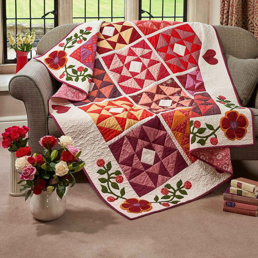 A beautiful combination of machine pieced star like quilted blocks and hand applique organic floral scrolls and hearts. This is the most perfect quilt pattern to embrace and enjoy different sewing techniques to create a beautiful piece for your home.